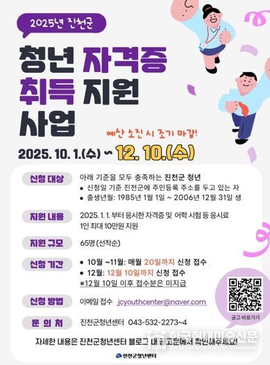 한국현대미술신문 신정은 기자 | 충북 진천군 청년센터는 10월부터 청년들의 직무 역량 강화와 진로 설계를 돕고 경제적 부담을 완화하기 위해 ‘청년 자격증 취득 지원사업’을 본격 시행한다고 9일 밝혔다.