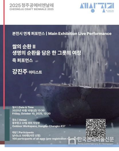 도예를 출발점으로 조각·설치·미디어 등 다채로운 장르를 넘나드는 이헌정과 함께하는 아티스트 토크는 오는 17일 오후 2시에 문화제조창 동부창고 38동에서 진행한다. 2025 청주공예비엔날레 준비한 마지막 국제공예워크숍의 자세한 일정 등은 홍보물을 참고하면 된다.