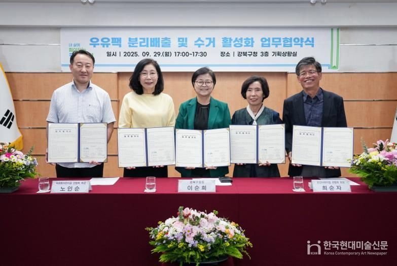 한국현대미술신문 배건 기자 | 서울 강북구는 9월 29일(월) 구청 기획상황실에서 강북구어린이집연합회와 어진이마을관리 사회적협동조합과 함께 우유팩 분리배출 및 수거 활성화 기반 구축을 위한 업무협약을 체결했다고 밝혔다.