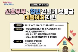 한국현대미술신문 배윤섭 기자 | 군포시는 신혼부부와 청년들의 주거비 부담 경감과 안정적인 거주환경을 위해 추진 중인 ‘군포시 신혼부부 및 청년 전월세 보증금 대출이자 지원사업’의 지원 기준을 대폭 완화하고 이에 따라 추가 지원 대상자를 모집한다고 밝혔다.