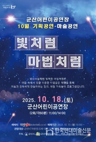 한국현대미술신문 기자 | 군산어린이공연장이 오는 10월 18일 어린이들의 상상력과 창의력을 자극하는 특별한 체험형 공연 '빛처럼 마법처럼'을 선보인다.