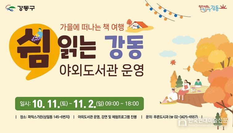 한국현대미술신문 배건 기자 | 강동구는 10월 11일부터 11월 2일까지 한 달간 파믹스가든(상일동 145-6)에서 주말 야외 도서관 '쉼 읽는 강동'을 운영한다고 밝혔다.