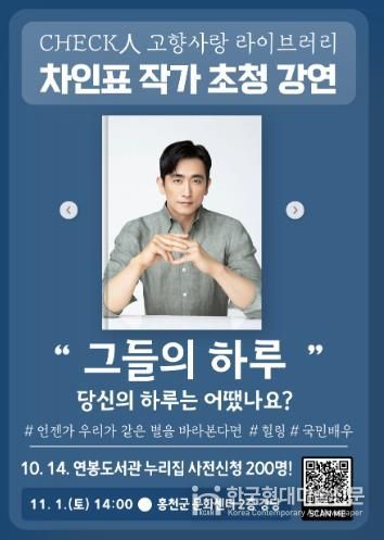 한국현대미술신문 원진 기자 | 홍천군립도서관은 11월 1일 오후 2시 홍천군 문화센터 2층 강당에서 차인표 작가를 초청하여 체크인 고향사랑 라이브러리 마지막 강연을 개최한다.