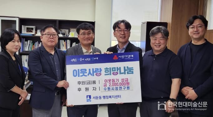 한국현대미술신문 배윤섭 기자 | 수원시정연구원과 수원시정연구원 사우회가 지난 10월 2일, 추석을 맞아 나눔을 실천하고자 성금 200만원을 서둔동 행정복지센터에 기탁했다. 이번 기탁금은 수원시정연구원장과 수원시정연구원 사우회에서 각 100만원을 모아 마련한 것이다.