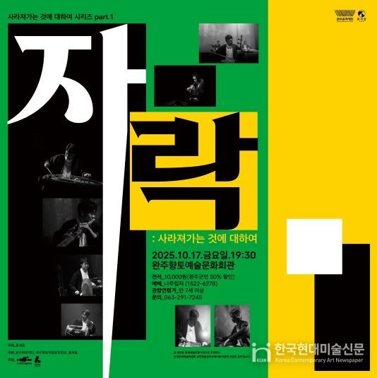 한국현대미술신문 기자 | 전북 완주군에 깊어가는 가을밤, 사라져가는 토속 민요의 숨결을 현대적인 감각으로 재조명하고 재해석한 특별한 국악 공연이 펼쳐진다. 완주문화재단은 오는 10월 17일, 완주향토예술문화회관에서 국악앙상블 불세출의 '자락: 사라져가는 것에 대하여' 공연을 개최한다