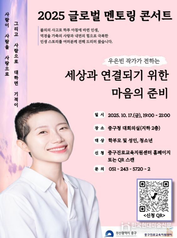 한국현대미술신문 정소영 기자 | 부산 중구는 중구 진로교육지원센터 주관으로 오는 10월 17일 오후 7시, 중구청 지하2층 대회의실에서 '2025 글로벌 멘토링 콘서트'를 개최한다.