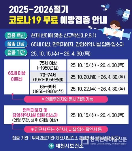 한국현대미술신문 신정은 기자 | 제천시는 오는 15일부터 65세 이상 어르신, 생후 6개월 이상 면역저하자, 감염취약시설 입원․입소자를 대상으로 신규 코로나 백신(LP.8.1)을 활용해 코로나19 무료 예방접종을 실시한다.