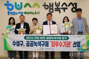 한국현대미술신문 정소영 기자 | 대구 수성구는 대구시 주관 2025 공공녹색제품 구매 평가에서 ‘최우수기관’으로 선정됐다고 밝혔다.