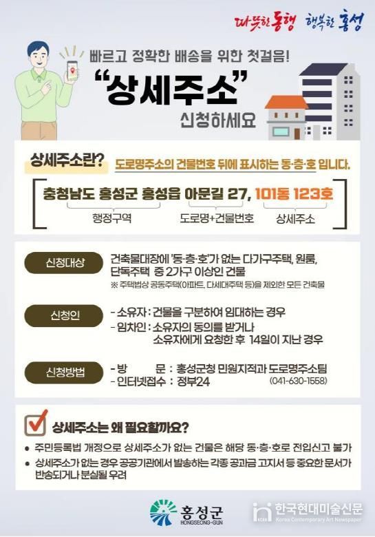 한국현대미술신문 신정은 기자 | 홍성군은 주민들의 생활 편의와 권리 보호를 위해 ‘상세주소 부여 신청’을 적극 홍보하고 있다고 밝혔다.
