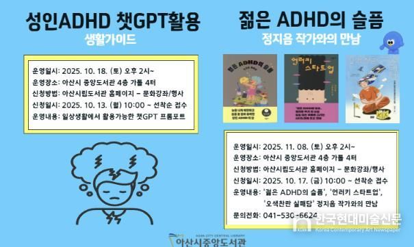 한국현대미술신문 신정은 기자 | 아산시립도서관은 성인 ADHD(주의력결핍 과잉행동장애)에 대한 사회적 인식 개선과 실질적인 생활 지원을 위해 오는 10월과 11월 중앙도서관에서 주제 특강을 운영한다고 밝혔다.