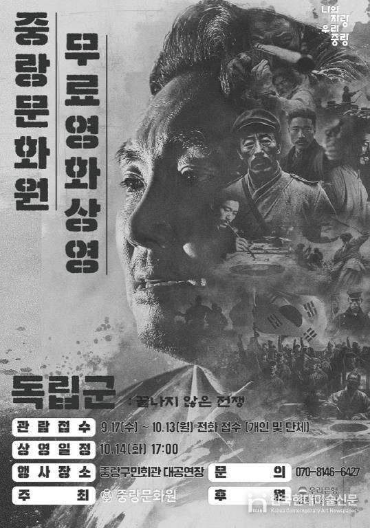 한국현대미술신문 배건 기자 | 중랑구는 오는 10월 14일 오후 3시와 5시, 중랑구민회관 대공연장에서 광복 80주년을 기념하는 영화 ‘독립군’을 상영한다. 이번 상영회는 중랑문화원이 주최해 선열들의 희생과 숭고한 뜻을 되새기는 특별한 자리로 마련됐다.