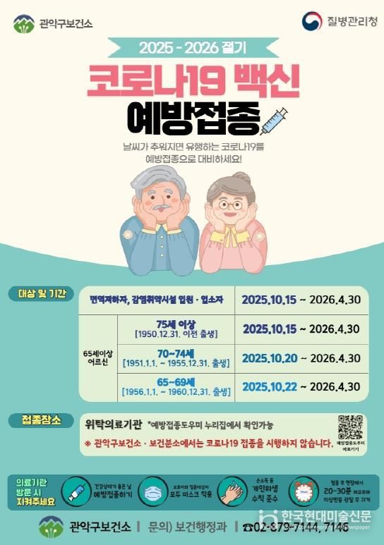 한국현대미술신문 배건 기자 | 관악구가 호흡기 질환이 증가하는 동절기 대비, 코로나19 감염 고위험군을 대상으로 코로나19 백신 무료 접종을 실시한다.