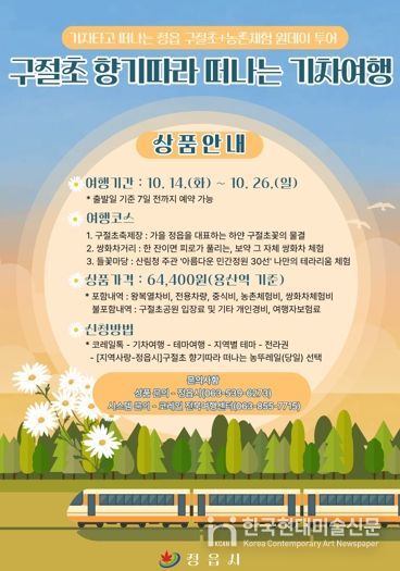 한국현대미술신문 기자 | 정읍시농업기술센터가 가을 여행철을 맞아 구절초 꽃축제와 농촌체험을 엮은 기차여행 상품 ‘농뚜레일 투어’ 참가자를 오는 19일까지 모집한다.