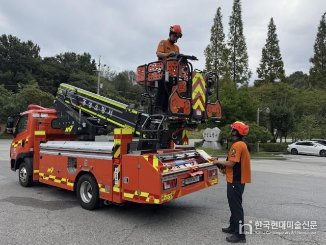 한국현대미술신문 신정은 기자 | 홍성소방서는 최근 늘어나는 고층건축물 화재에 신속히 대응하기 위해 경량사다리차 조작 숙달훈련을 실시했다고 13일 밝혔다.