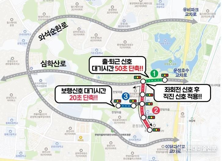 한국현대미술신문 배윤섭 기자 | 파주시는 출퇴근 시간대에 신호주기가 길어 불편했던 운정 한빛마을 5단지 및 2·5단지 소도로 일대 구간의 신호체계를 우선적으로 개선했다고 밝혔다.