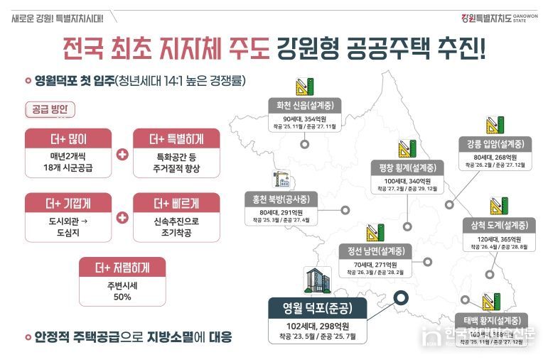 한국현대미술신문 원진 기자 | 강원특별자치도는 청년과 신혼부부 등 지역 정착 인구 확대를 위한 안정적인 주택공급을 목표로 전국 최초의 지자체 주도형 주거모델인 강원형 공공주택 사업을 적극 추진하고 있다고 밝혔다.