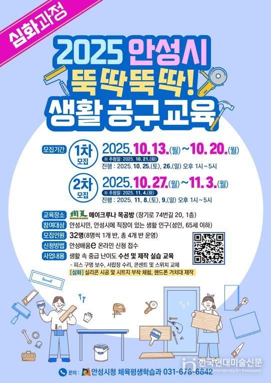 한국현대미술신문 배윤섭 기자 | 안성시는 시민들의 생활 자립 역량 강화를 위해 '뚝딱뚝딱 생활 공구[심화과정] 교육'을 오는 10월 25~26일과 11월 8~9일, 총 2회 주말 일정으로 운영한다고 밝혔다.