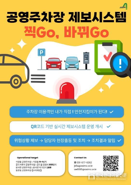한국현대미술신문 배윤섭 기자 | 안성시시설관리공단은 10월 10일부터 원곡면, 석정동, 공도 저류지, 동본동(수탁예정)공영주차장 4개소 대상으로, 이용객이 직접 주차장의 위험요소나 이용 불편사항을 손쉽게 제보하고 개선에 참여할 수 있는 QR 코드 기반의 실시간 위험상황 제보시스템 “찍Go, 바뀌Go”를 운영한다고 밝혔다.