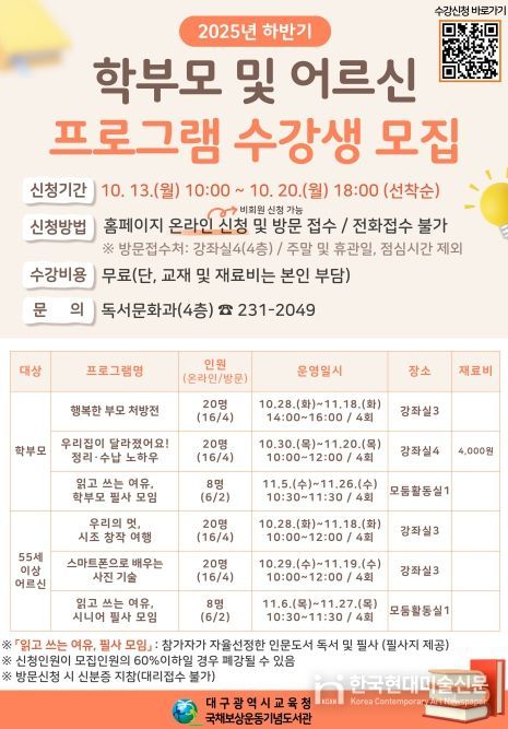 어르신 대상으로는 ▲시조를 이해하고 창작해 보는 ‘우리의 멋, 시조 창작 여행, 스마트폰 카메라 활용법’, ▲사진 편집 방법을 익힐 수 있는 ‘스마트폰으로 배우는 사진 기술’ 프로그램을 운영한다. 또한, ▲학부모 및 어르신 대상 자율 선정한 인문도서를 필사하는 ‘읽고 쓰는 여유, 필사 모임’을 진행한다.