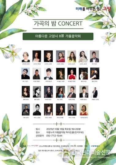 한국현대미술신문 배윤섭 기자 | 고양특례시가 후원하고, (사)한국예술문화단체총연합회 고양지회가 주최하며 (사)한국음악협회 고양지부가 주관하는 ‘2025 가곡의 밤 – 아름다운 고양시 8경(景) 가을 음악회’가 오는 16일 오후 7시 30분, 고양아람누리 아람음악당에서 개최된다.