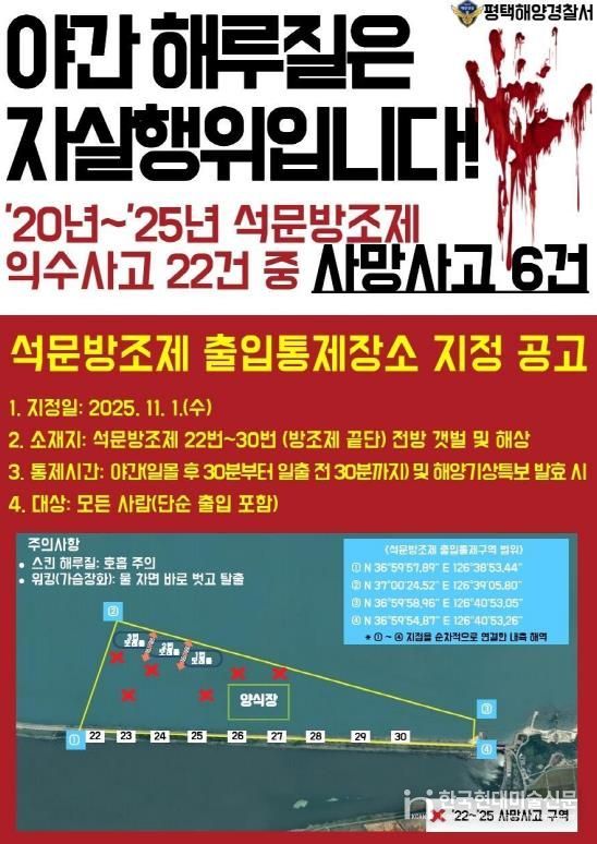 당진시는 계도기간 동안 전광판을 활용해 야간 출입 통제 홍보물을 송출할 계획이며, 11월 대조기 기간 평택해경과 합동 단속을 나설 예정이다.