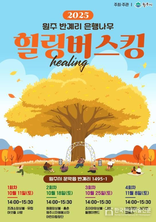 홍순필 원주시 관광과장은 “반계리 은행나무 광장에서 가족 및 지인들과 함께 버스킹 공연을 즐기며 음악과 웃음이 있는 가을을 보내시길 바란다”라고 말했다.