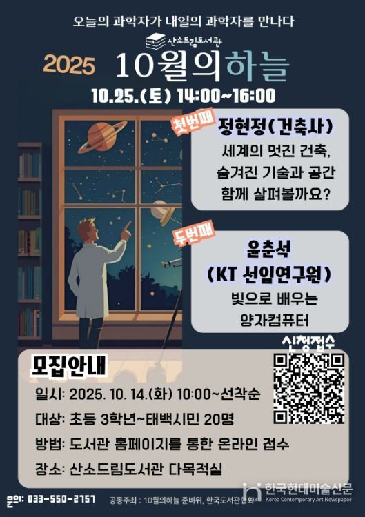 한국현대미술신문 원진 기자 | 태백시는 산소드림도서관이 한국도서관협회와 ‘10월의 하늘’ 준비위원회가 공동 주최하는 재능기부 도서관 과학강연 '10월의 하늘' 공모사업에 선정됐다고 밝혔다.