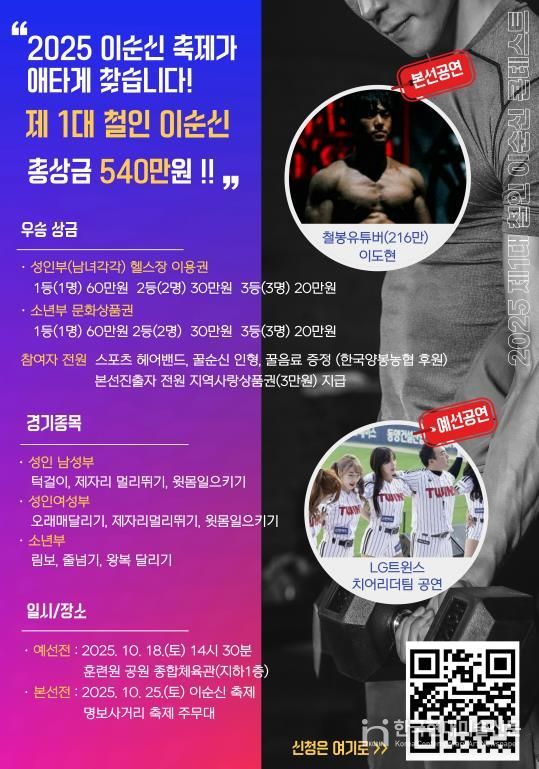 본선은 오는 25일 ‘2025 이순신 축제’에서 펼쳐진다. 본선은 한 종목으로 승부를 가른다. 성인 남성부는 턱걸이, 성인 여성부는 오래매달리기, 소년부는 줄넘기로 최종 우승자를 결정한다. 동별 단체전은 4명의 주민이 한 팀을 이뤄 총 1,545m를 로잉머신으로 가장 빠르게 완주하는 방식으로 진행된다. 이 거리는 이순신 장군의 탄생연도 ‘1545년’을 상징하며, 경기 모습은 LED 전광판을 통해 생중계된다. 여기에 구독자 216만명을 보유한 유명 철봉 유튜버 이도현 씨가 특별 공연을 펼치며 현장의 열기를 끌어올릴 예정이다.
