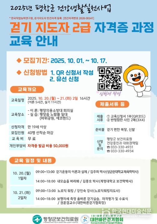한국현대미술신문 원진 기자 | 평창군보건의료원은 군민의 건강한 걷기 문화를 확산하기 위해 오는 10월 20일부터 21일까지 2일간 ‘걷기 지도자 2급 자격증 과정’ 교육을 운영한다.