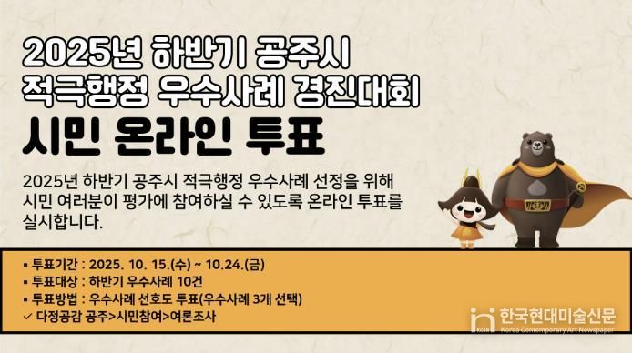 한국현대미술신문 신정은 기자 | 공주시는 올해 하반기 적극행정 우수사례 선정을 위해 시민을 대상으로 한 온라인 투표를 10월 15일부터 24일까지 실시한다고 밝혔다.