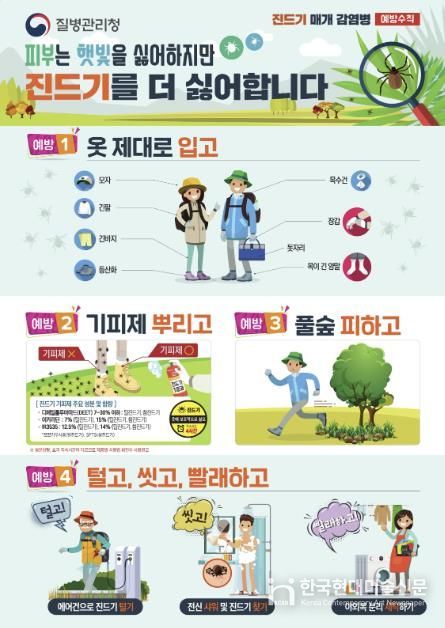 진드기 매개 감염병 예방을 위해서는 ▲야외 활동 시 진드기 기피제 사용 및 긴소매·긴바지·모자 등 착용으로 피부 노출 최소화 ▲야외활동 후 즉시 샤워 및 옷 갈아입기 ▲얼굴, 귀, 몸통 등에 진드기 부착 여부 확인 등의 수칙을 지켜야 한다.