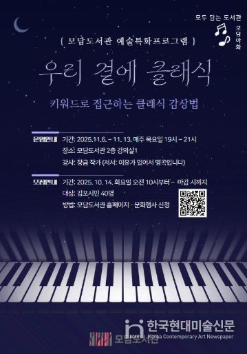 한국현대미술신문 배윤섭 기자 | 김포시 모담도서관은 클래식을 주제로 11월 6일부터 13일까지 매주 목요일 오후 7시부터 9시까지 특별 강연을 운영한다.