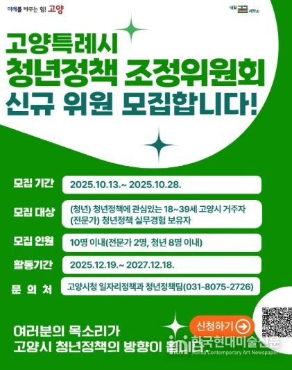 한국현대미술신문 배윤섭 기자 | 고양특례시는 청년이 시정의 주체로 참여해 정책을 함께 만들어갈 수 있도록 고양시 청년정책조정위원회 청년 및 전문가 위원을 공개 모집한다고 밝혔다.