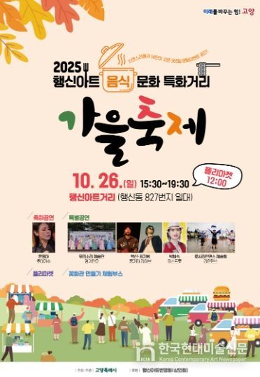 한국현대미술신문 배윤섭 기자 | 고양특례시는 오는 26일 오후 3시 30분부터 오후 7시 30분까지 ‘행신아트 음식문화 특화거리 가을축제’를 행신아트거리 일대에서 개최한다고 밝혔다.