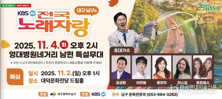 한국현대미술신문 정소영 기자 | 대구 남구는 국내 최장수 인기 프로그램인 KBS 전국 노래자랑 ‘대구 남구편’이 오는 11월 4일 오후 2시, 영대병원네거리 남편 특설무대에서 열린다고 밝혔다.