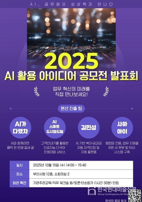 한국현대미술신문 정소영 기자 | 부산시는 오늘(15일) 오후 2시, 시청 12층 소회의실2에서 '2025년 에이아이(AI) 활용 아이디어 공모전 발표회'를 개최한다고 밝혔다.