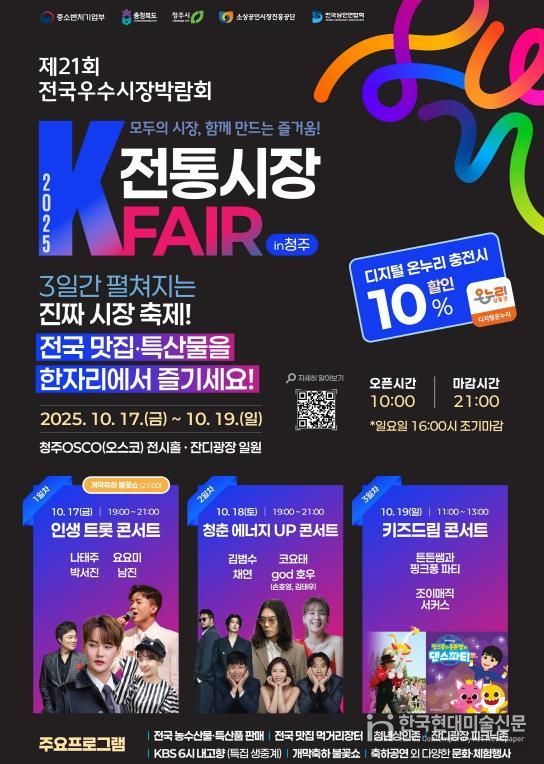한국현대미술신문 신정은 기자 | 청주시는 ‘2025 전국 우수시장 박람회(K-전통시장 페어 in 청주)’가 오는 17일부터 19일까지 3일간 청주오스코에서 개최된다고 밝혔다.