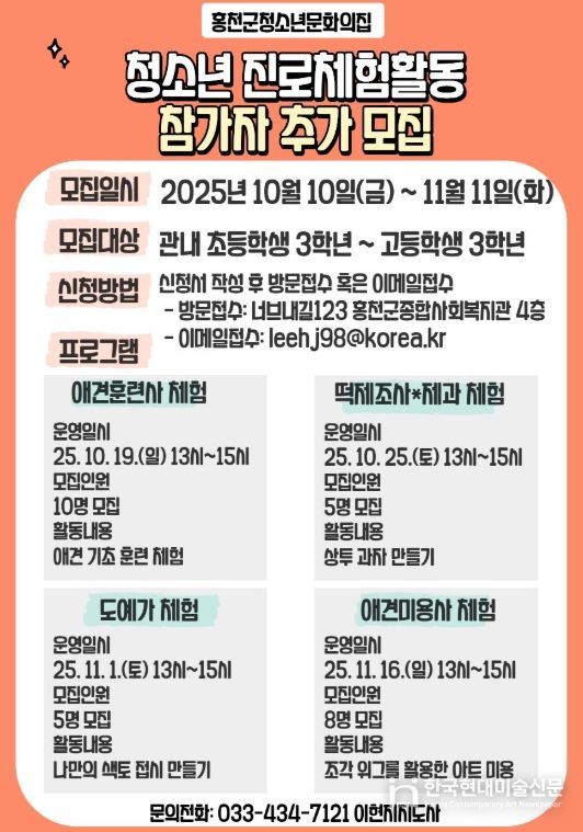 한국현대미술신문 원진 기자 | 홍천군청소년문화의집은 관내 청소년을 대상으로 운영 중인 청소년 진로체험활동 참가자 모집 대상을 초등학교 3학년까지 확대하여 추가 모집한다.