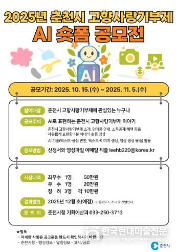 춘천시 관계자는 “빠르게 진화하는 온라인 콘텐츠 지형 변화에 발맞춰 AI 특화 공모전을 마련했다”며 “생성형 AI를 통해 상상 속 아이디어가 구현되고 더 많은 사람에게 전해지는 계기가 되길 바란다”고 말했다.