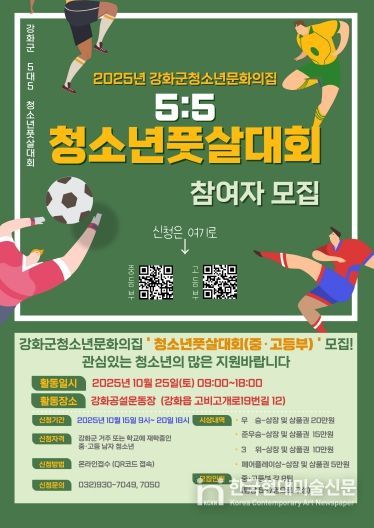 한국현대미술신문 박재남 기자 | 강화군시설관리공단(이사장 박영길)에서 운영하는 청소년 문화의 집이 오는 15일~20일, 관내 중․고등 남학생을 대상으로 강화군 청소년 풋살대회 참가자(팀)를 모집한다고 밝혔다.
