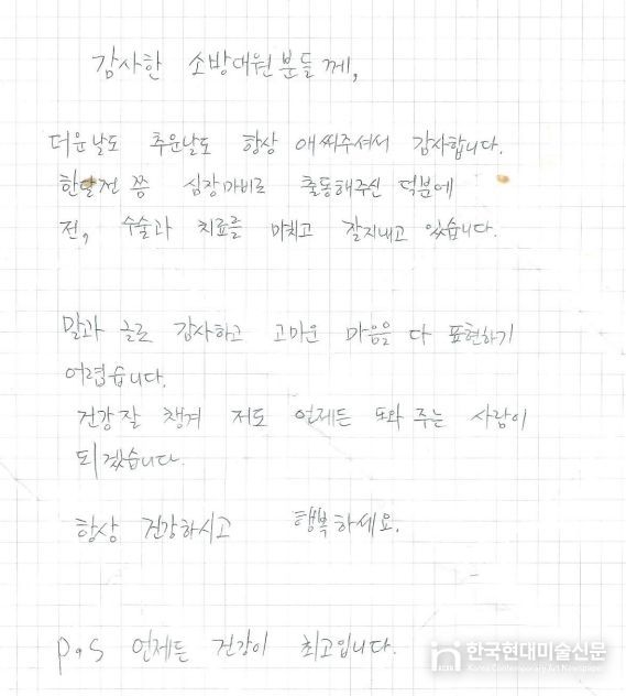 김원형 구급대원은 “당연히 해야 할 일을 했을 뿐인데 이렇게 감사 인사를 받아 오히려 부끄럽다”며 “A씨가 건강을 회복하고 퇴원하셨다는 소식을 들으니 뿌듯하다”고 말했다.