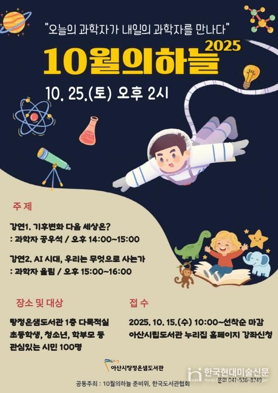 한국현대미술신문 신정은 기자 | 아산시는 오는 25일, 탕정온샘도서관과 꿈샘어린이청소년도서관에서 ‘10월의 하늘’ 과학 강연을 개최한다고 밝혔다.