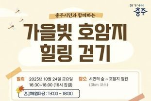 정상구 충주시보건소장은 “호암지는 충주시민이 가장 사랑하는 산책 명소로, 가을빛 풍경 속에서 건강과 즐거움을 동시에 느낄 수 있는 소중한 시간이 될 것”이라며 “많은 시민들이 가족, 이웃과 함께 참여해 일상 속 건강한 변화를 경험하시길 바란다”고 전했다.