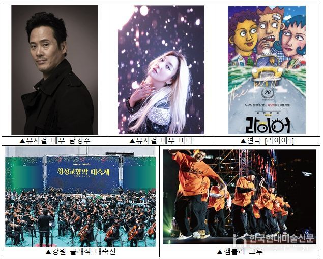 또한 “꽃피는 강원문화”를 주제로 하는 라이브페인팅 퍼포먼스, 그리고 뮤지컬배우 남경주 · 바다의 축하공연과 국민연극 [라이어1]를 만나볼 수 있다.