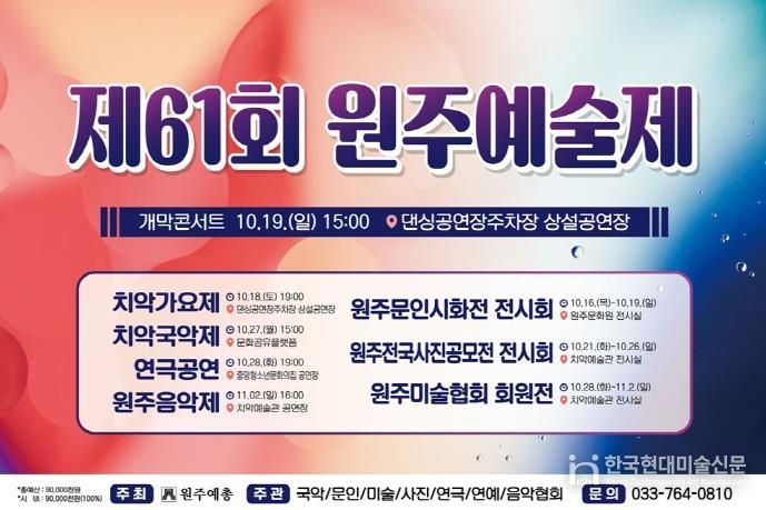 한국현대미술신문 원진 기자 | (사)원주예총은 오는 10월 16일부터 11월 2일까지 원주시 댄싱공연장 주차장 상설공연장과 치악예술관 전시실 등 원주 전역에서 시민과 함께하는 ‘제61회 원주예술제’를 개최한다.