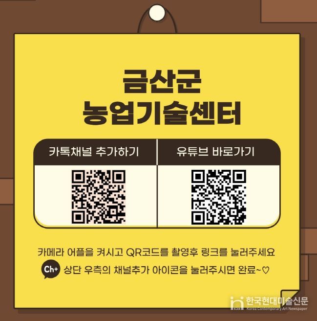 한국현대미술신문 신정은 기자 | 금산군농업기술센터는 농업인과 군민들이 더 쉽고 빠르게 농업 정보를 접할 수 있도록 카카오톡과 유튜브 홍보 채널 운영을 하고 있다고 밝혔다.