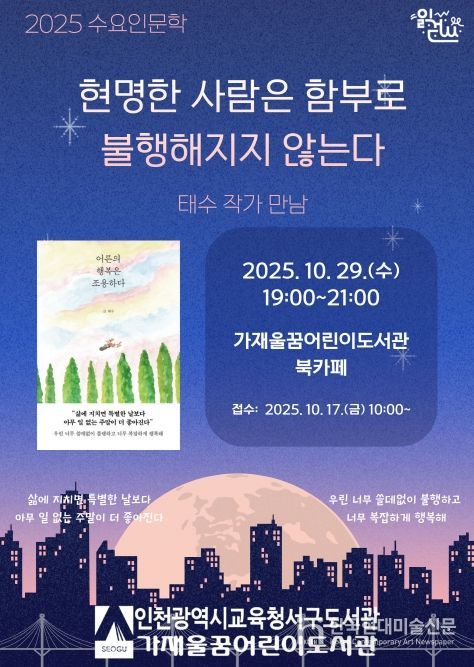 한국현대미술신문 박재남 기자 | 인천광역시교육청서구도서관은 10월 29일 오후 7시부터 9시까지 『어른의 행복은 조용하다』의 저자 태수 작가를 초청해 ‘수요인문학’ 강연 ‘현명한 사람은 함부로 불행해지지 않는다’를 진행한다.