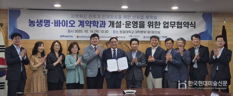 한국현대미술신문 기자 | 전북특별자치도교육청은 16일 원광대학교 대학본부에서 지역혁신 전 주기(全周期) 인재양성 인재 양성을 위한 ‘직업계고 선취업 계약학과 운영 업무협약’을 체결했다고 밝혔다.