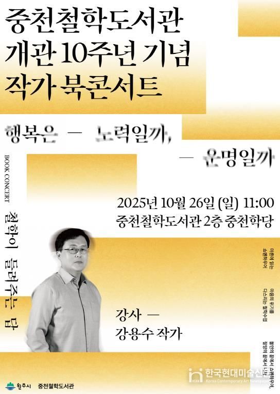 한국현대미술신문 원진 기자 | 원주시 중천철학도서관은 오는 26일 오전 11시, 개관 10주년 기념 작가 북콘서트를 개최한다.
