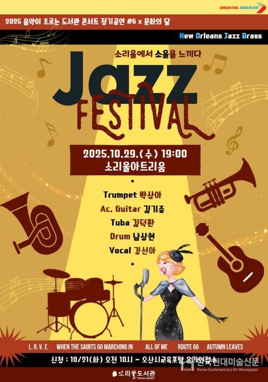 한국현대미술신문 배윤섭 기자 | 경기도 오산시는 오는 10월 29일 오후 7시, 소리울도서관 3층 소리울아트리움에서 '2025 음악이 흐르는 도서관 콘서트 정기공연 #6 × 문화의 달 – Jazz Festival; 소리울에서 소울을 느끼다'를 개최한다고 밝혔다.